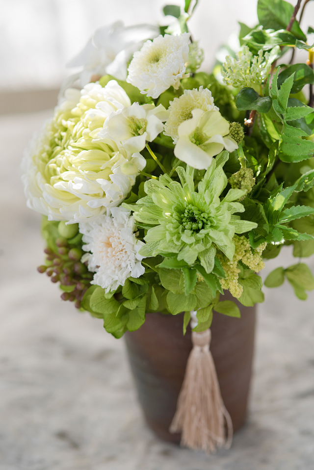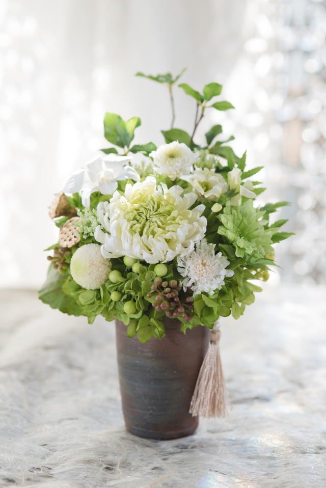 商品の花器、花材は、製造中止になることがある為、その場合は似た材質・色合いでお作りすることがありますのであらかじめご了承下さい。